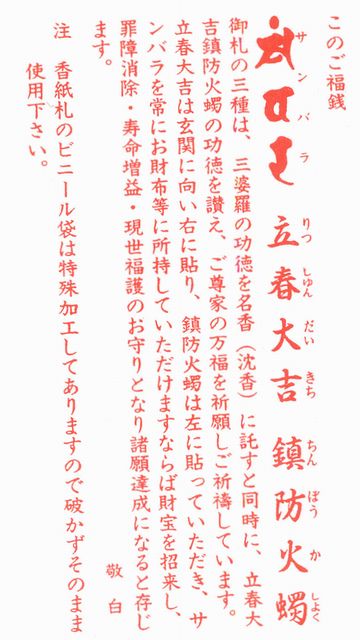 | 沈香の香りを独自の製法で御札に閉じ込めた、当社オリジナルの福銭サンバラ(三婆羅)3点セットです。封筒に御札の説明がありますので、檀家様への配布に最適です。サンバラの功徳を銘香に託して、ご尊家の万福を御祈願下さい。 沈香の香りが入った御札(福銭)は、お財布などに所持していただき、同封のシールは玄関に貼ってお使い下さい。 | |